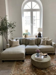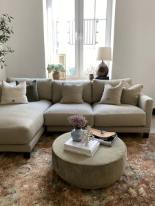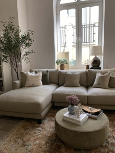 Narożnik z serii mebli LAYLA wykorzystuje opływowe detale nowoczesnego wzornictwa i zapewnia luksusowy komfort użytkowania wykorzystując w pełni zarówno swoją formę jak i funkcjonalność. Narożnik LAYLA został zaprojektowany z myślą o komforcie wypoczynku. Poduszki siedziskowe jak również oparciowe posiadają zdejmowane pokrowce, dzięki czemu czyszczenie ich stanie się dużo łatwiejsze i przyjemniejsze. W zestawie znajdują się dodatkowo dwie mniejsze poduszki dekoracyjne w tej samej tkaninie. Stelaż narożnika wykonany został z wysokiej jakości drewna bukowego, który został osadzony na metalowych nóżkach malowanych na czarno. Dostosuj narożnik do swojego domu korzystając z szerokiej oferty wysokiej jakości tkanin i stwórz swoją wymarzoną przestrzeń.