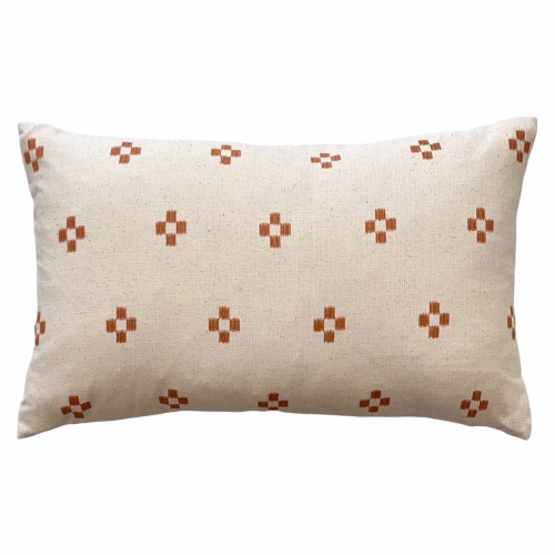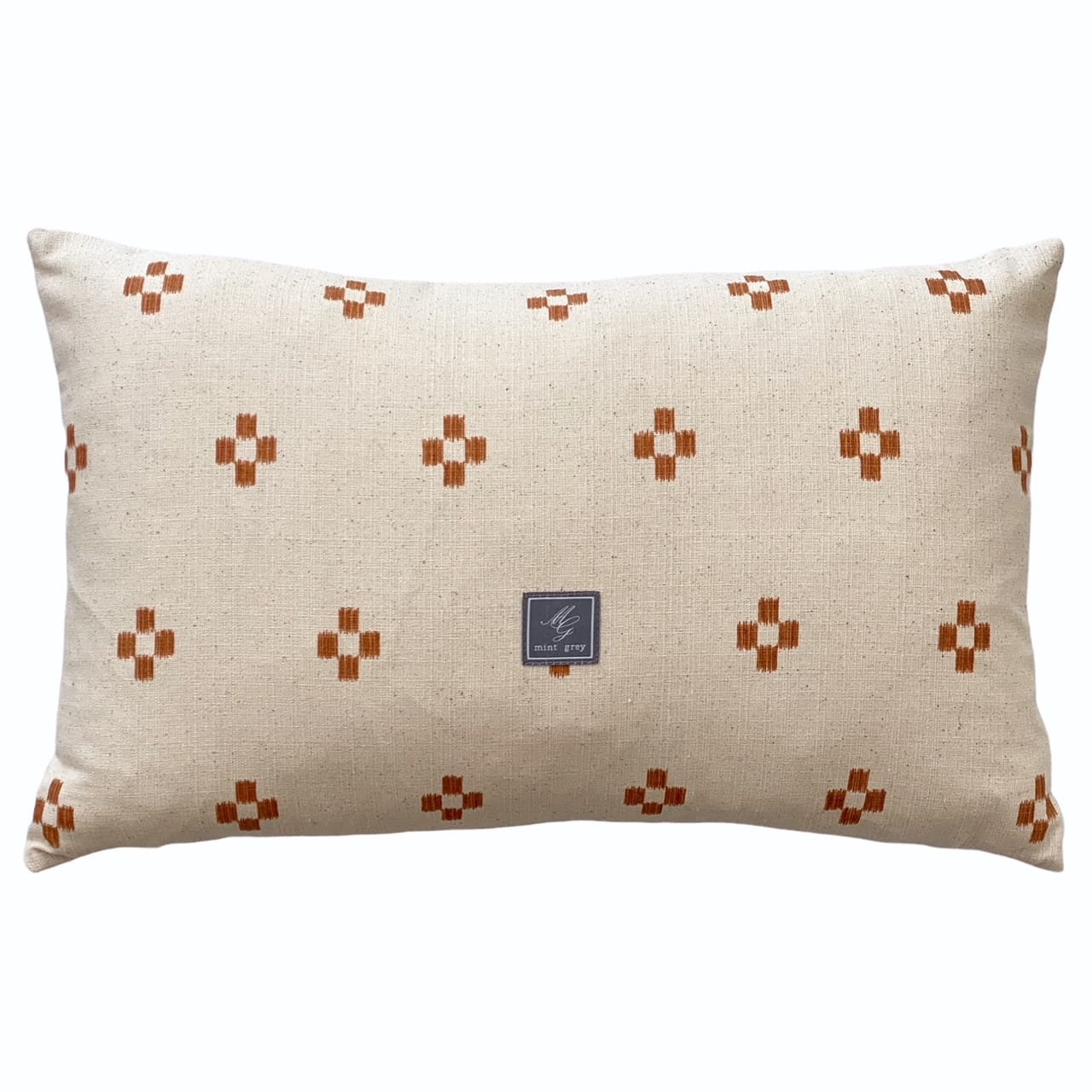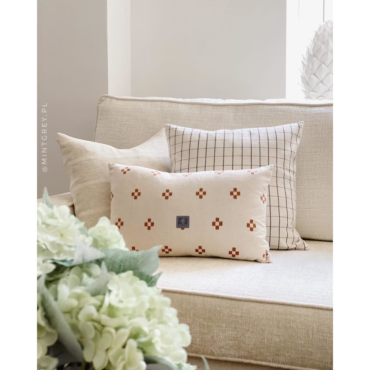 Dwustronna poszewka dekoracyjna wykonana z tkaniny bawełnianej o naturalnym splocie. Na tle w kolorze surowej, niebarwionej bawełny znajduje się bardzo delikatny, geometry wzór w odcieniu rudości. Nasze poduszki zawsze posiadają jedną stronę gładką, a drugą z naszywką Mint Grey - z doświadczenia wiemy, że wolicie je eksponować od strony naszywki, ale to to Ty decydujesz, czy ma być widoczna.