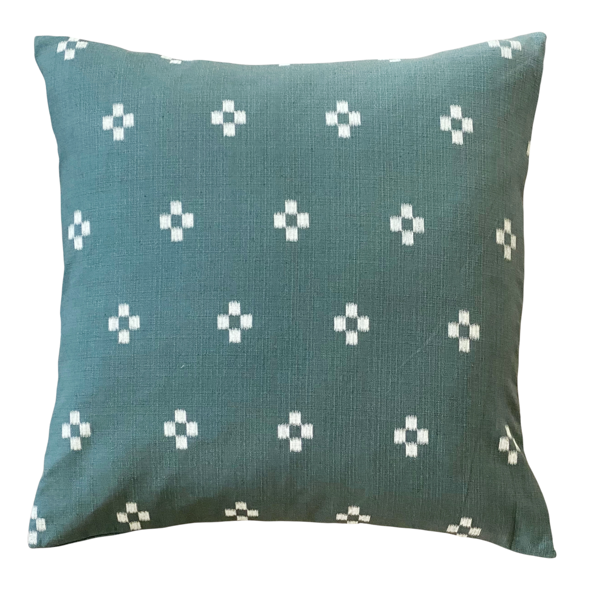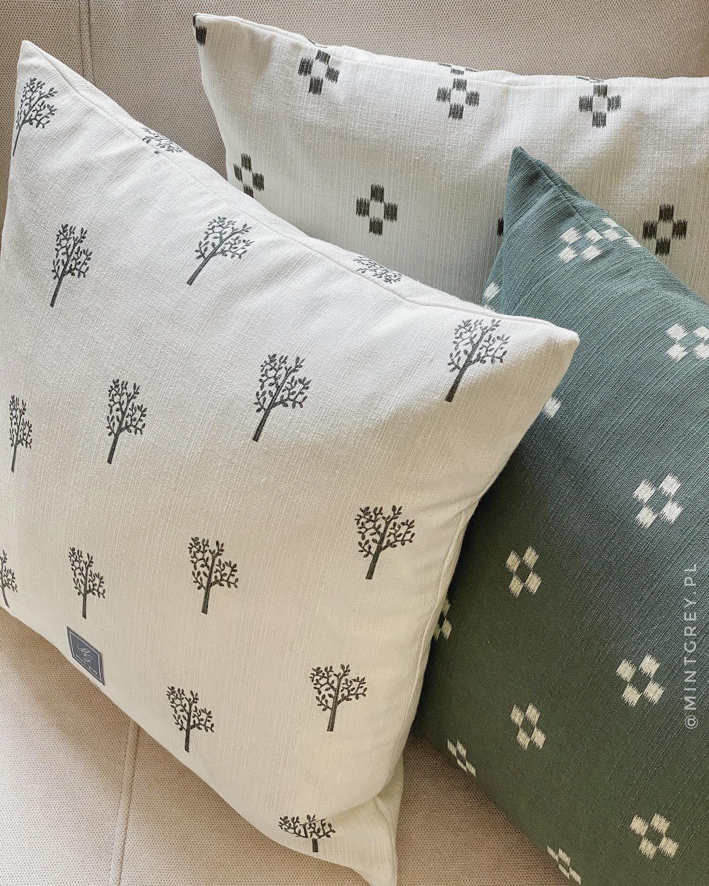 Dwustronna poszewka dekoracyjna wykonana z delikatnej tkaniny bawełnianej o bardzo ciekawej fakturze. Piękny, zielony odcień stanowi tło dla jasnych symetrycznych wzorów, które powstały w wyniku tkanej kremowej nici. Nasze poduszki zawsze posiadają jedną stronę gładką, a drugą z naszywką Mint Grey - z doświadczenia wiemy, że wolicie je eksponować od strony naszywki, ale to to Ty decydujesz, czy ma być widoczna.