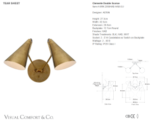 Podwójny Kinkiet CLEMENTE to nowoczesny, minimalistyczny reflektor. Jego design to połączenie szlachetnych materiałów i stylu vintage. W wyniku takiego zabiegu osiągnięto nowoczesny, klasyczny i elegancki kinkiet. Charakterystyczny klosz w kształcie stożka, z ramieniem i okragłą podstawą, w kolorze antycznego mosiądzu, jest połączeniem idealnym do wnętrz w stylu Modern Farmhouse, Hamptons oraz Nowojorskim.
