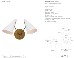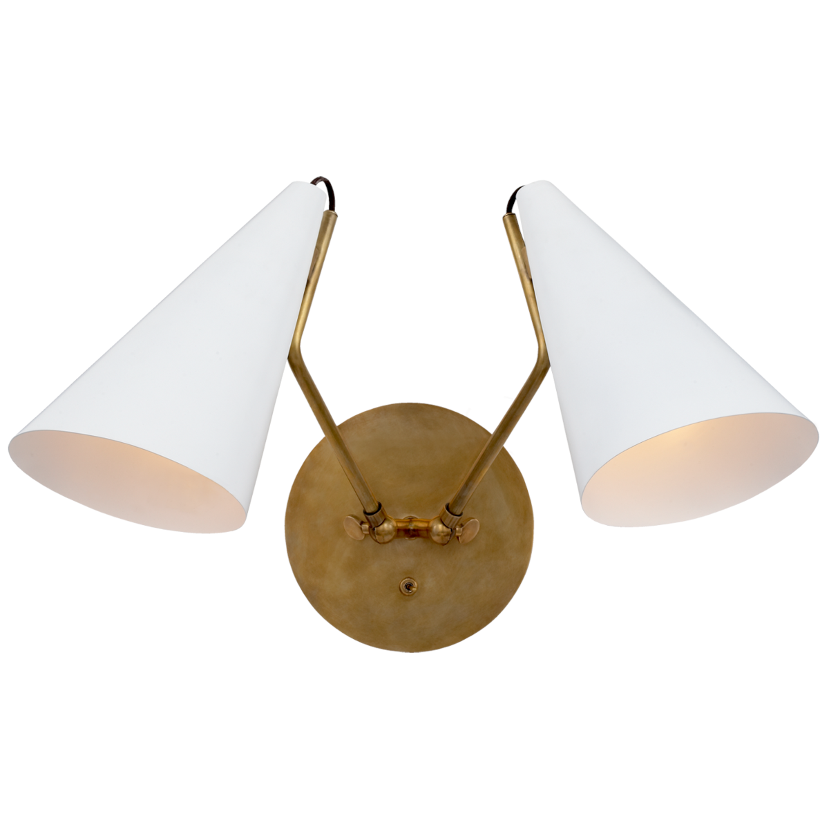 Podwójny Kinkiet CLEMENTE to nowoczesny, minimalistyczny reflektor. Jego design to połączenie szlachetnych materiałów i stylu vintage. W wyniku takiego zabiegu osiągnięto nowoczesny, klasyczny i elegancki kinkiet. Charakterystyczny klosz w kształcie stożka w kolorze białym, z ramieniem i okragłą podstawą w kolorze antycznego mosiądzu, jest połączeniem idealnym do wnętrz w stylu Modern Farmhouse, Hamptons oraz Nowojorskim.