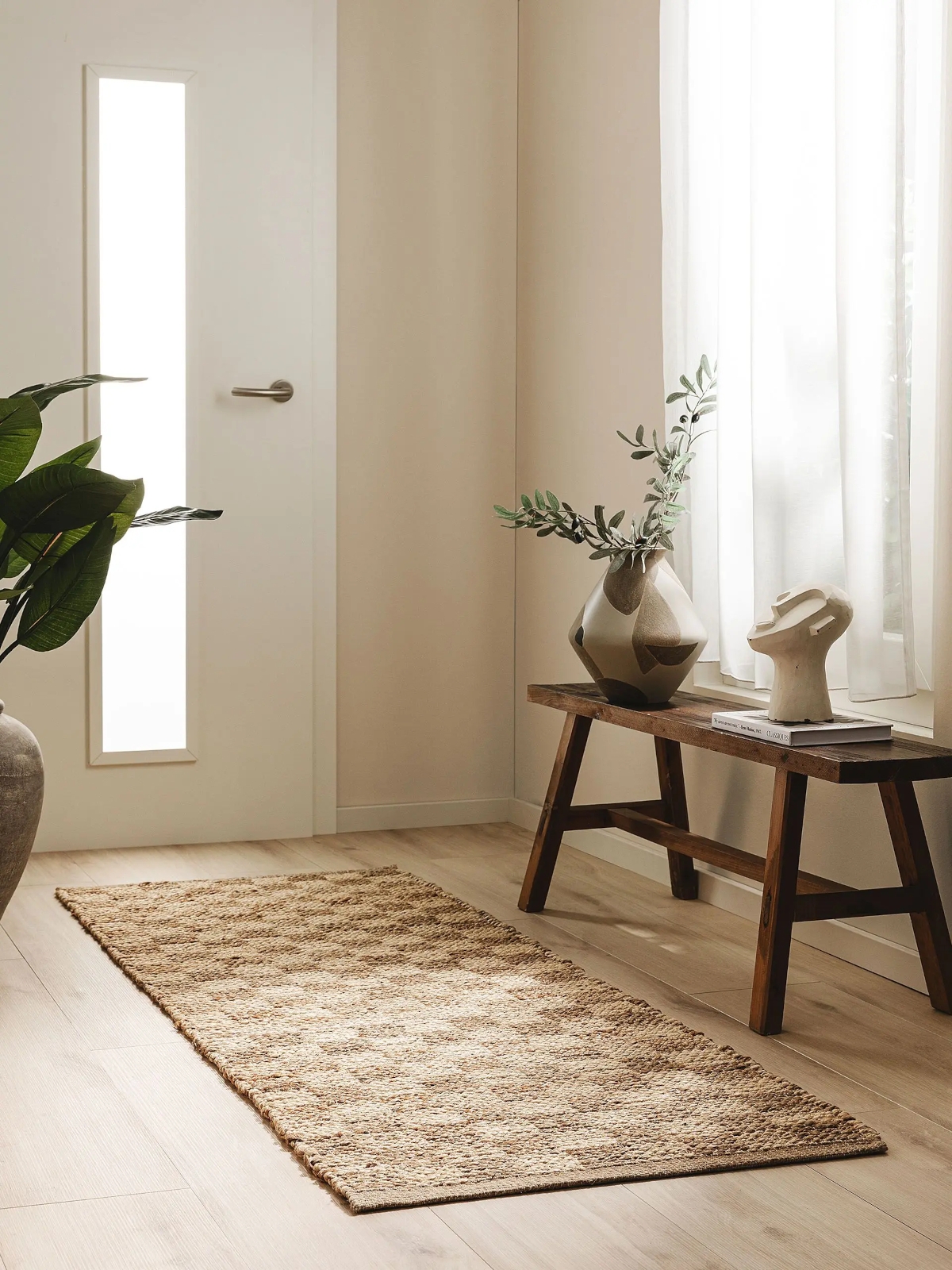NELIO to piękny jutowy chodnik, który zachwyca geometrycznym wzorem oraz klasyczną, beżowo-brązową kolorystyką. Dzięki niemu wprowadzisz do swojego wnętrza harmonię i przytulność. NELIO świetnie sprawdzi się w takich pomieszczeniach jak: salon, sypialnia, przedpokój, a nawet kuchnia czy łazienka. Doskonale dopasuje się do wielu przestrzeni - dzięki uniwersalnej formie dobrze będzie wyglądał w różnych projektach i stylach wykończeń wnętrz. Najlepiej dopasuje się do klimatów boho, rustykalnych, skandynawskich oraz naturalnych aranżacji z drewnianymi meblami. Ponadto, chodnik NELIO występuje również w formacie dywanu, dzięki czemu dopasujesz go idealnie pod swoje wymagania i preferencje.