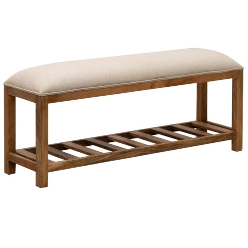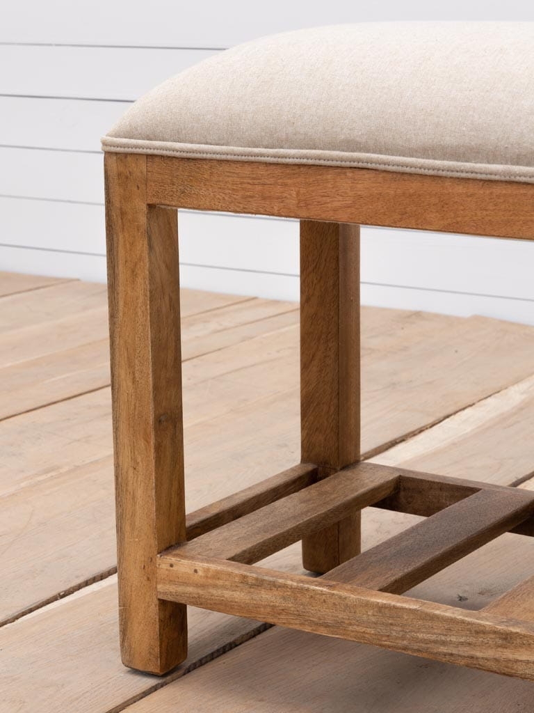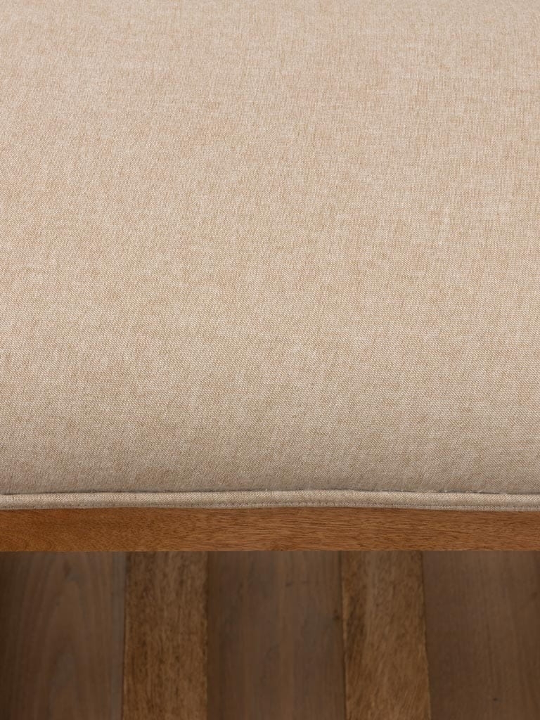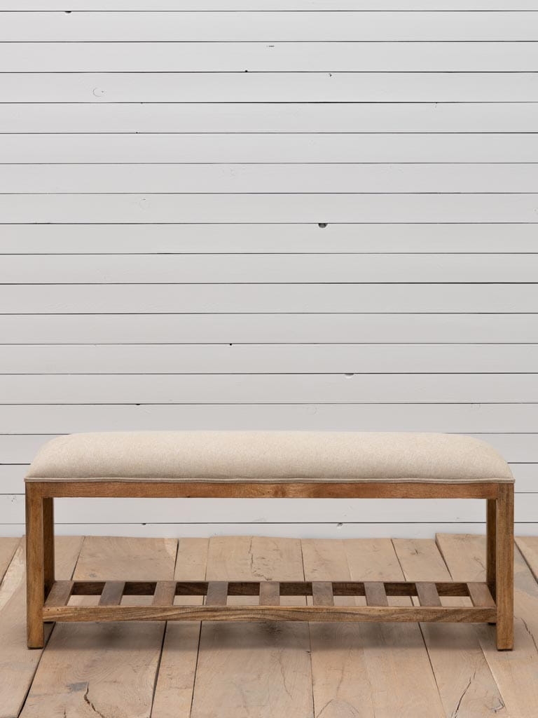 Efektowna ławka tapicerowana, która urozmaici Twoje wnętrze. Produkt doskonale sprawdzi się postawiony przed Twoim łóżkiem w sypialni, co uczyni pomieszczenie bardziej funkcjonalnym oraz podniesie jego estetykę. Ławka zaprezentuje się świetnie również w przedpokoju, gdzie stanie się praktycznym elementem wystroju. Deseczki na dole konstrukcji wyglądają pięknie, ale mogą posłużyć Ci również jako półka - zmieścisz tam koc, poduszki, czy inne dekoracje. Delikatne, lniane obicie tapicerskie, doskonale łączy się z przytulnym odcieniem drewna mango, tworząc spójną i efektowną całość.