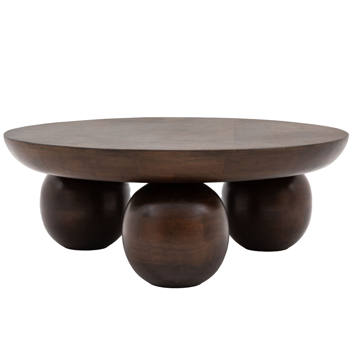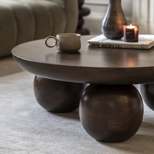 Duży drewniany stolik kawowy LARC to solidna konstrukcja i wyjątkowy design. Gruby blat stolika został osadzony na podstawie z trzech masywnych, toczonych kuli .Piękne drewno mango zostało wybarwione na kolor przypominający ciemny orzech. Stolik LARC to idealne rozwiązanie dla osób szukających dużego, okrągłego stolika, przy którym swobodnie będzie mogła odpoczywać większa liczba gości. Drewno mango cechuje się wyjątkową trwałością i naturalnym urokiem, co sprawia, że mebel ma unikalny charakter. Ponadto, drewno mango ma piękne naturalne odcienie brązu, które dodają ciepła i przytulności do wnętrza. Stolik świetnie wpasuje się w przestrzeń w salonie przy narożniku lub dużej sofie.