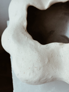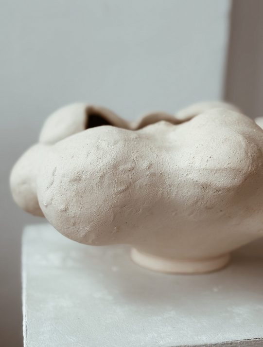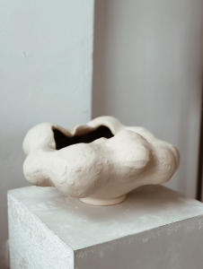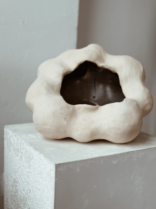 Wyjątkowy obiekt wykonany z białej gliny w charakterystycznym dla autorki stylu chmury. Wewnątrz szkliwiony, co nadaje mu subtelny połysk i elegancję. Organiczną formą doskonale wpasuje się w minimalistyczne i nowoczesne aranżacje, wprowadzając do wnętrza lekkość i artystyczny akcent.