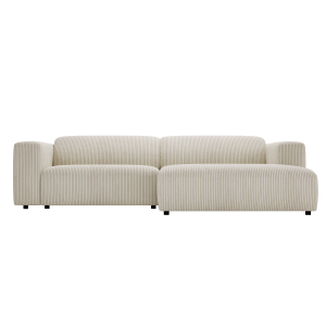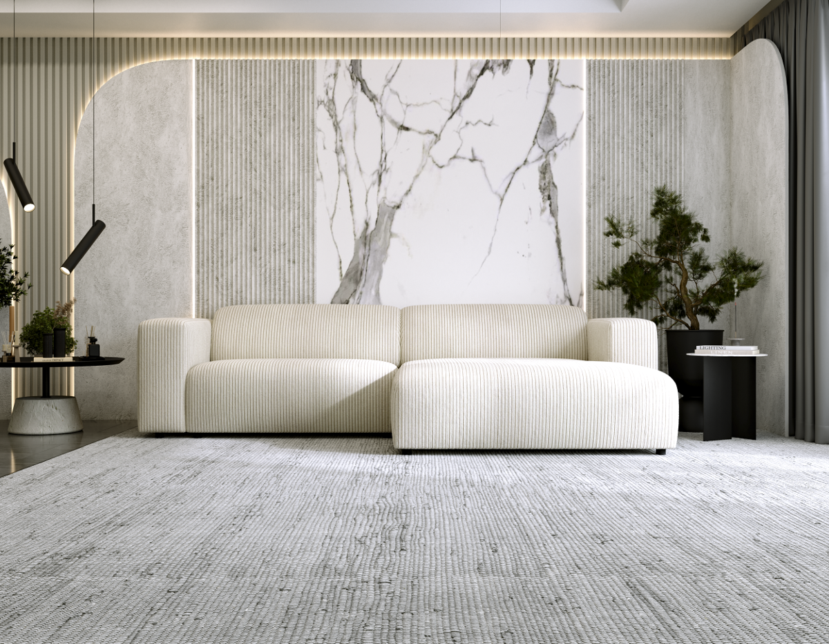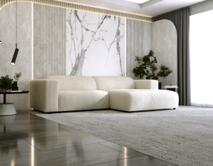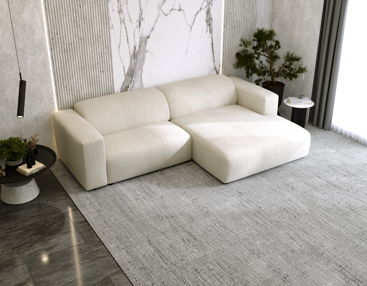 Narożnik Tapicerowany LARISSA w kształcie litery L, prawy- lub lewostronny posiada dwie duże poduszki oparciowe, oraz piękny, tapicerowany tył. Siedzisko narożnika wykonane zostało z wysoko elastycznej pianki oraz sprężyn falistych. Poduszki oparciowe wykonane zostały z mieszanki pianki poliuretanowej oraz silikonu co daje wyjątkowy komfort użytkowania oraz długowieczność. Dzięki ponadczasowej stylistyce narożnik sprawdzi się w nowoczesnym, jak i klasycznym wnętrzu. Każdy z mebli charakteryzuje się niezwykłą wygodą oraz miękkimi poduchami na siedzisku i oparciu. Mebel ma bardzo prosty design. Idealnie wpisuje się w aranżacje Mid Century Modern czy Modern Farmhouse.
