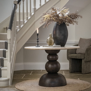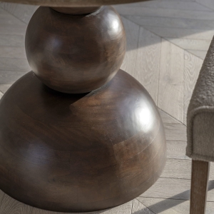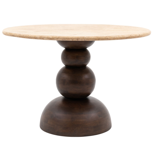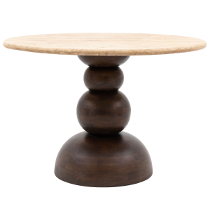 Okrągły drewniany stół LARC to ciekawa propozycja do Twojej jadalni. Składa się z solidnej podstawy z drzewa mango oraz trawertynowego blatu. Głęboki odcień drewna tworzy piękny kontrast z jasnym naturalnym kamieniem, jakim jest trawertyn. Kolory jak i materiały doskonale do siebie pasują i uzupełniają się. Stół o tej średnicy swobodnie pomieści 4 krzesła. Drewno mango cechuje się wyjątkową trwałością i naturalnym urokiem, co sprawia, że mebel ma unikalny charakter. Ponadto, drewno mango ma piękne naturalne odcienie brązu, które dodają ciepła i przytulności do wnętrza.