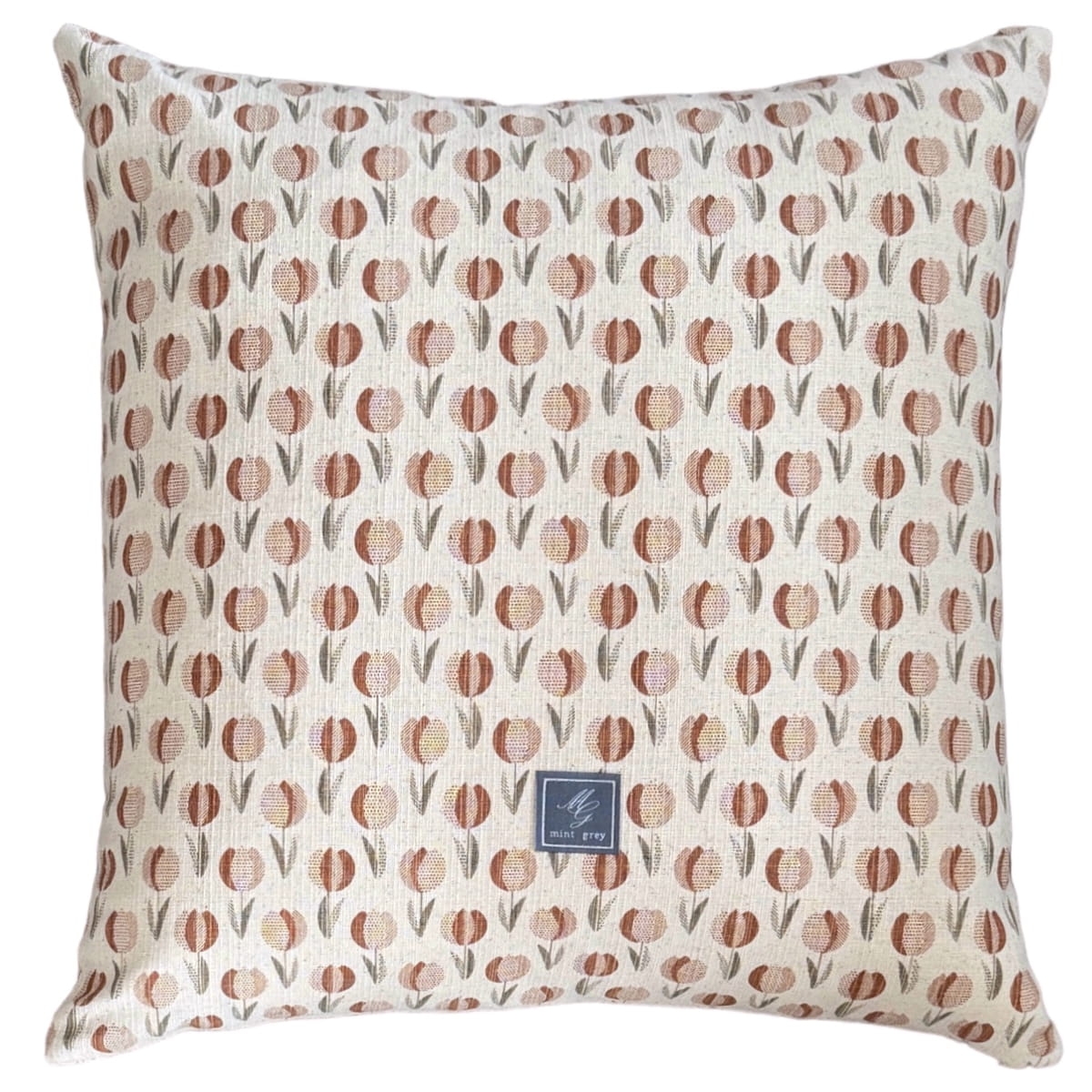 Poduszka dekoracyjna TULIP posiada nietuzinkowy, kwiatowy wzór tulipanów w kolorze zgaszonej pomarańczy. Przykuwa wzrok i z pewnością będzie ciekawym elementem w Twoim wnętrzu. Poduszka posiada z jednej strony naszywkę z logo Mint Grey, zapinana jest na suwak. Wykonana z najwyższą dbałością o detale.